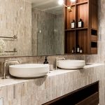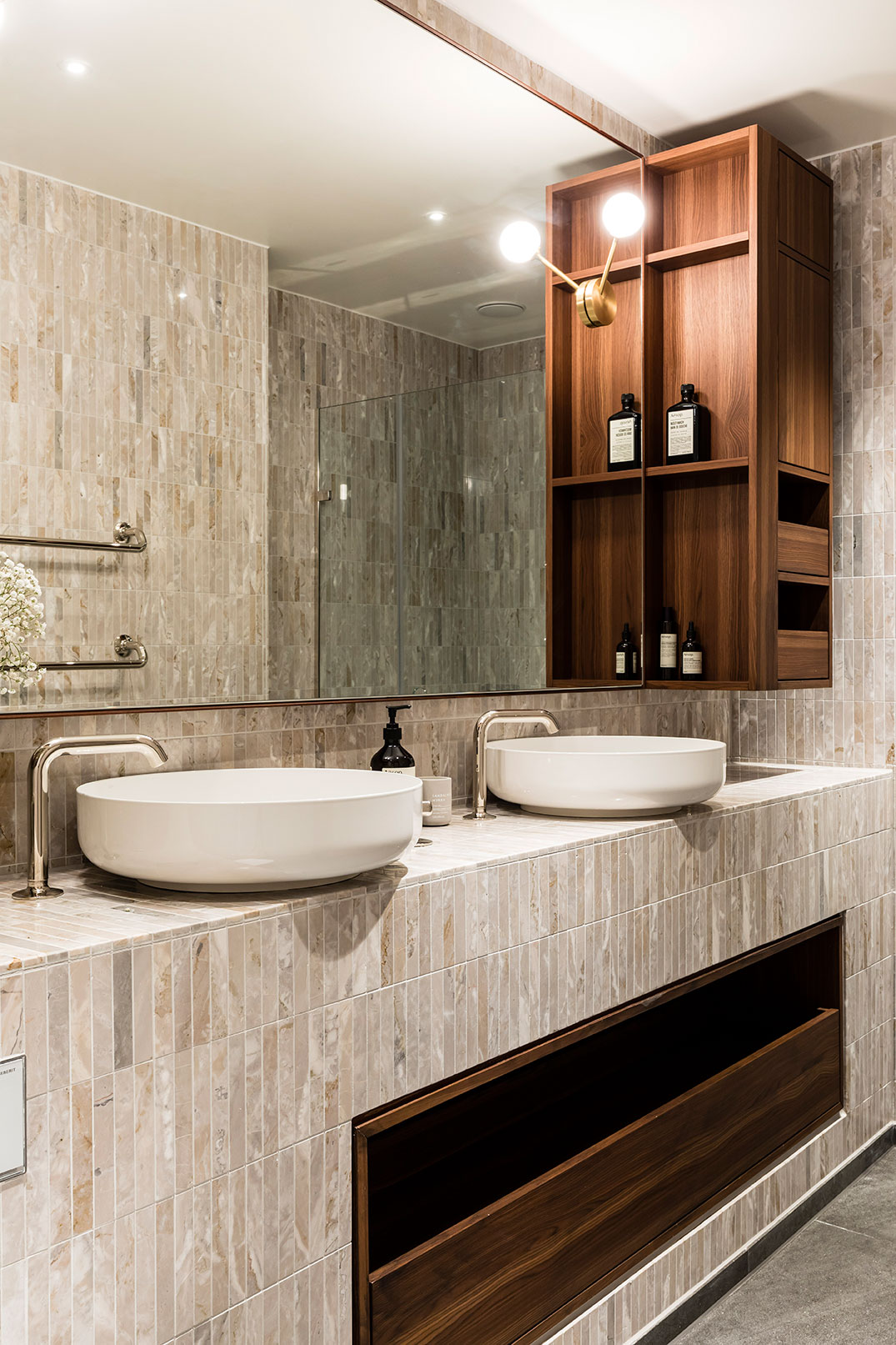 • Mirror wall with demisting function and dark stained oak vanity unit with shaving point
