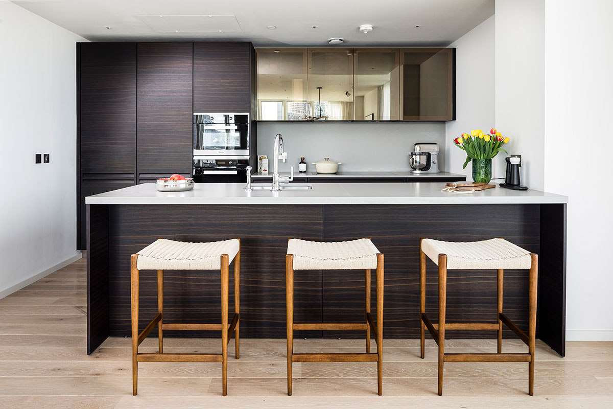 • Bespoke Italian kitchens by Poliform Varenna with Spessart oak veneered doors- to-base units and bronzed glass doors-to- wall units featuring a soft close function to doors and drawers and complemented by under cabinet lighting